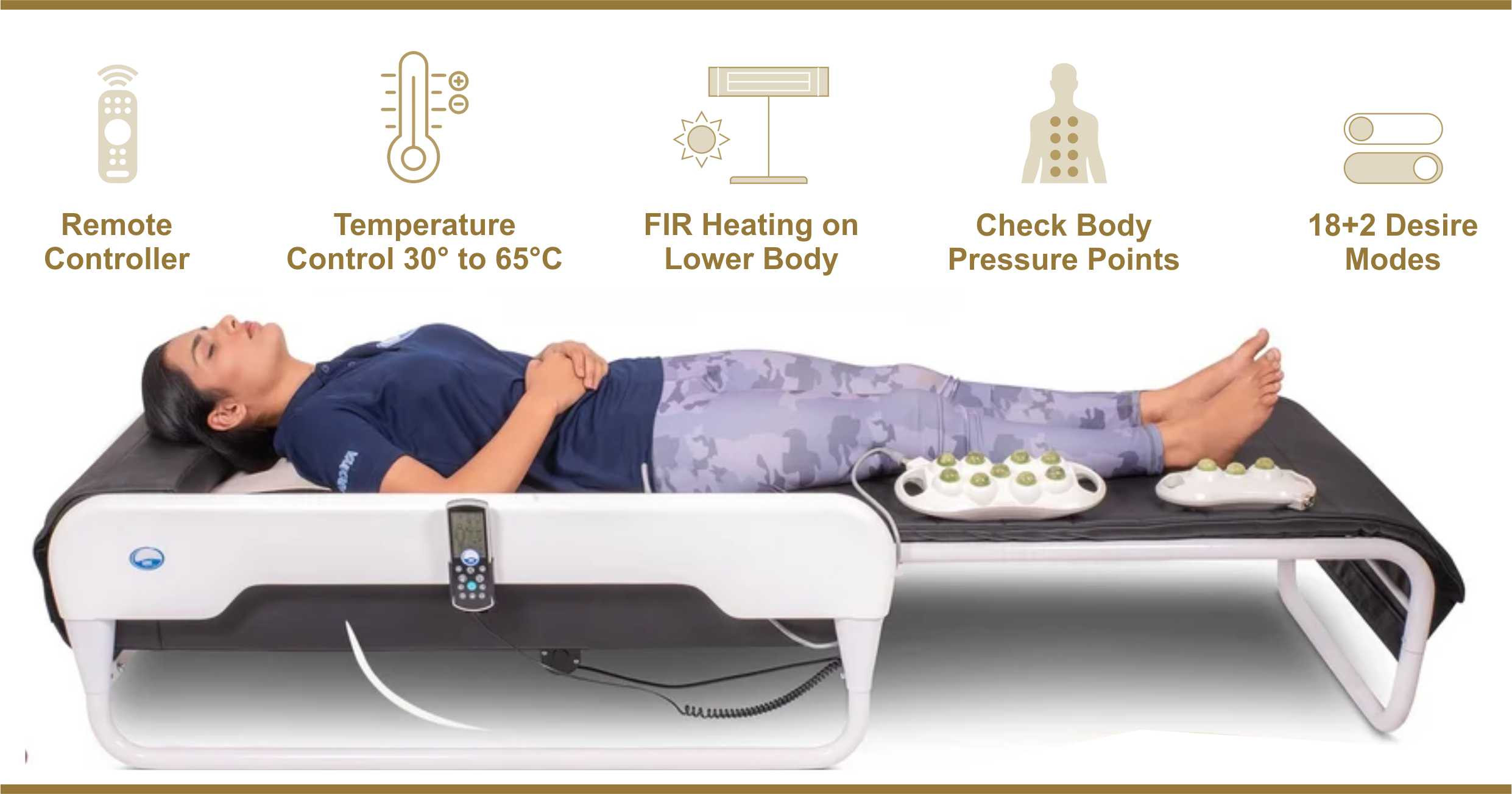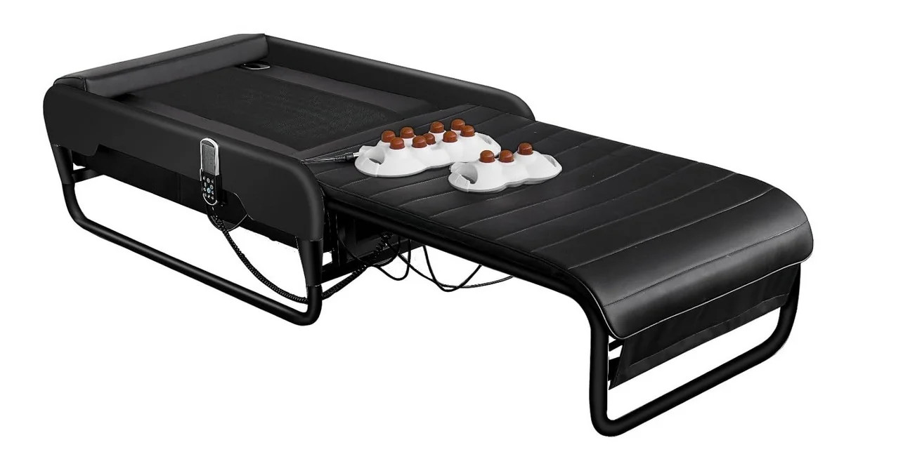 Massager Bed features premium jade stones that emit deep infrared heat to improve blood circulation, detoxify the body, and revive tissues. With intelligent spine scanning, heating system, breathing programs, and heavy-duty jade stone rollers, it offers advanced therapeutic relaxation and total-body wellness.